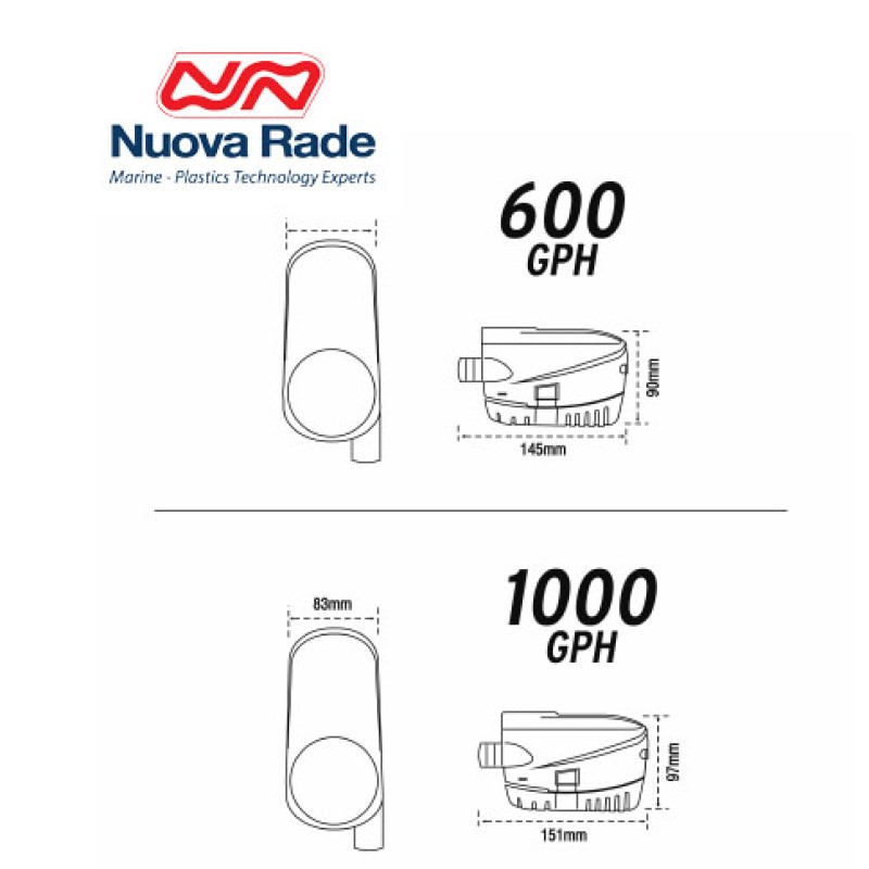La bomba de achique automática sumergible Nuova Rade combina calidad y facilidad de uso en un solo dispositivo. Su desmontaje es muy sencillo, tanto para su instalación como para su limpieza. Incorpora un interruptor de flotador automático que la activa cuando sube el nivel del agua de la sentina, lo que permite que funcione incluso sin supervisión. La bomba también cuenta con un botón de prueba manual que permite probar tanto el interruptor de nivel como la bomba. Además, su base de filtro a presión facilita la instalación y el mantenimiento. Está fabricada en ASA resistente. Su capacidad de bombeo es de 600 GPH con una manguera de 19 mm (3/4") y 1000 GPH con una manguera de 25 mm (1"). Fusibles de 3 A, 4 A y 7,5 A. 12 V y 24 V CC. Con un motor potente y fiable y una eficiencia real del 100 % en galones. Certificación CE.