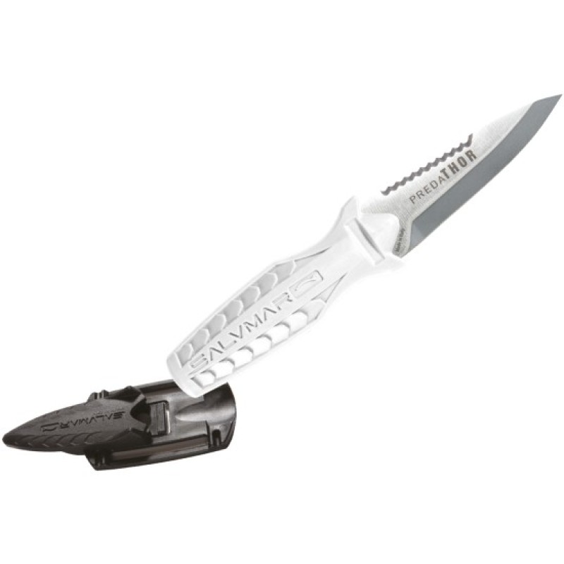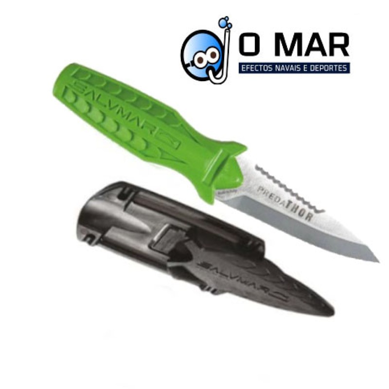 Cuchillo compacto , ideal para la pesca submarina, acero inox 420, doble cara de corte, liso y dentado, nueva empuñadura ergonómica, disponible en color verde ácido.