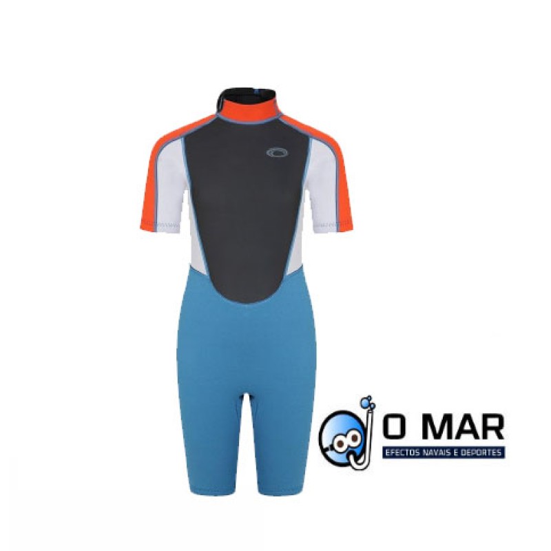 El traje Junior de neopreno 2.8 de 2,8 mm cuenta con paneles delanteros y traseros lisos, costuras planas y cremallera trasera.